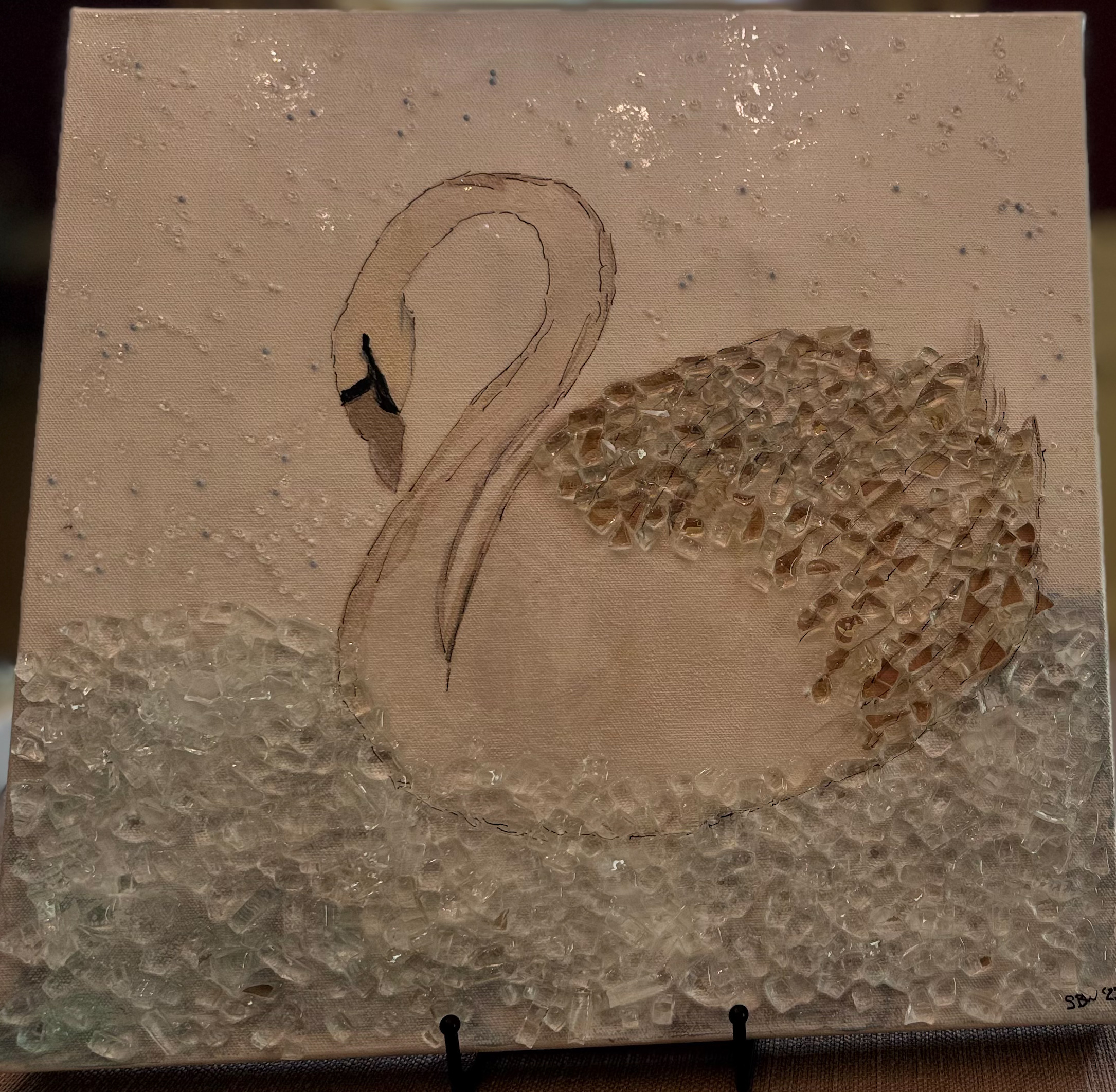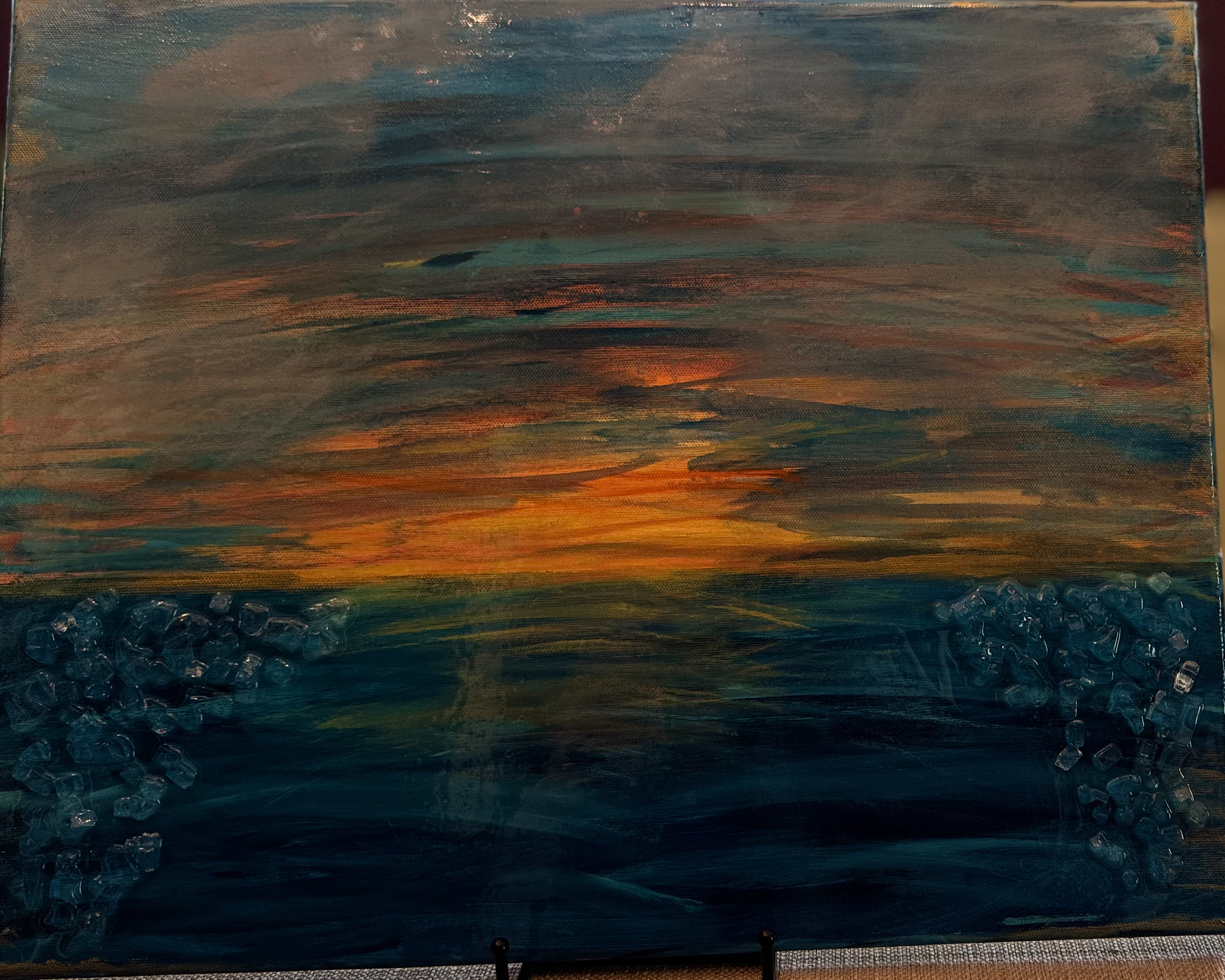 This piece captures that magical pause between wave and shore. Layers of glass, shells, and soft coastal hues create a richly textured beach scape, where every detail feels like something discovered rather than placed. From the shimmer of the sea glass to the gentle curve of the tide, your eye is invited to wander and linger.